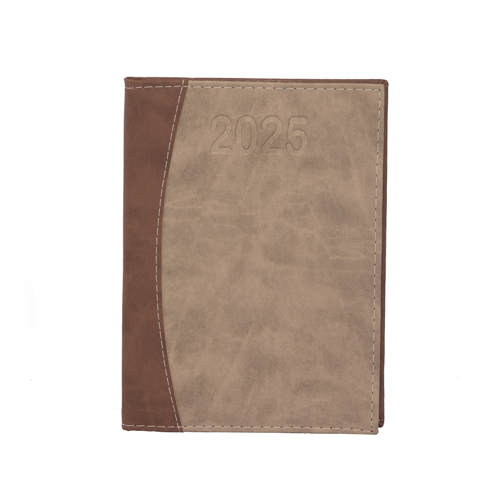Agenda diária 2025 de couro sintético. Contém fita de cetim marca página, dados pessoais, calendário de 2024 à 2026, mapa do Brasil, mapa-múndi, índice telefônico e planejamento. OBS.: PEDIDOS APENAS MÚLTIPLOS DE 10 PEÇAS!