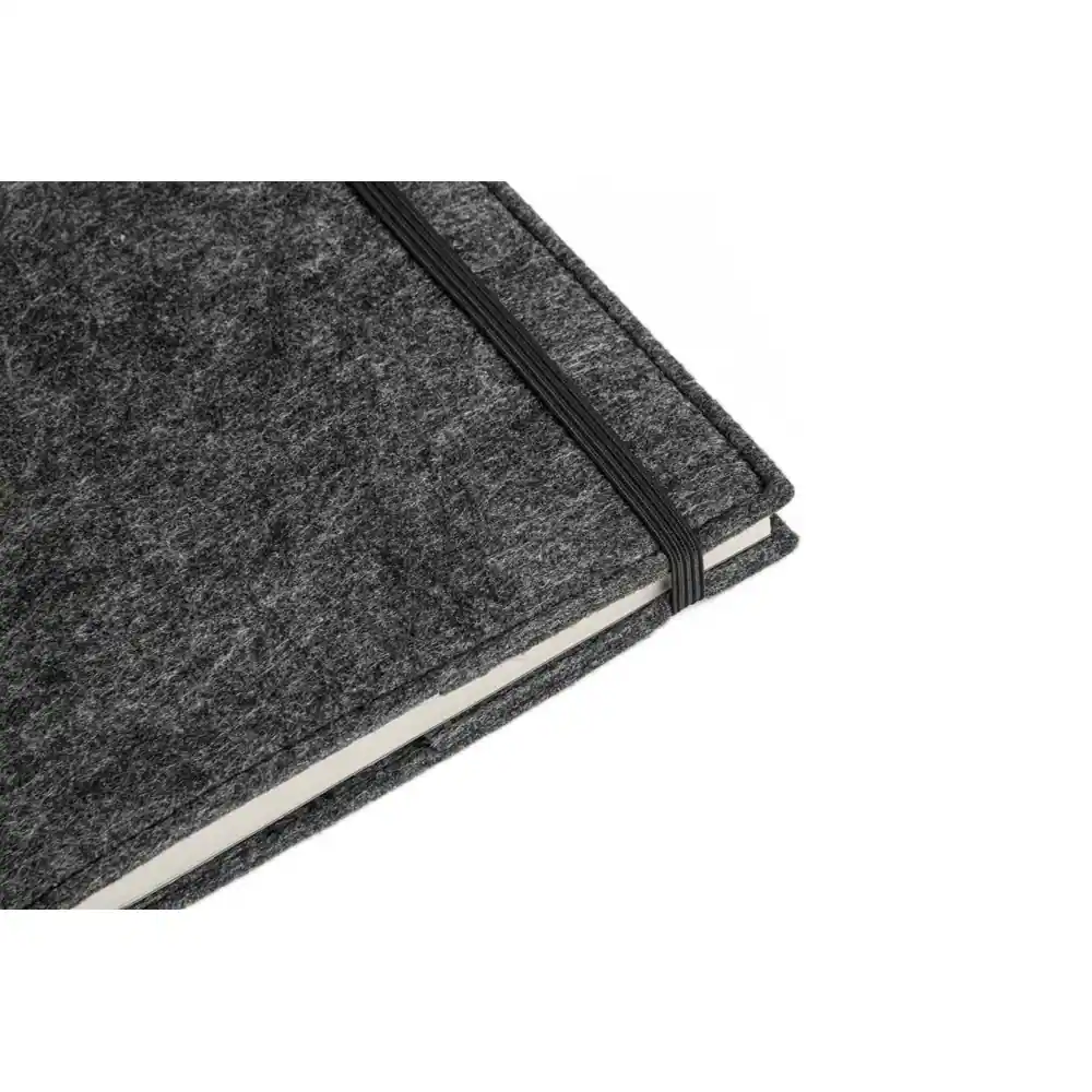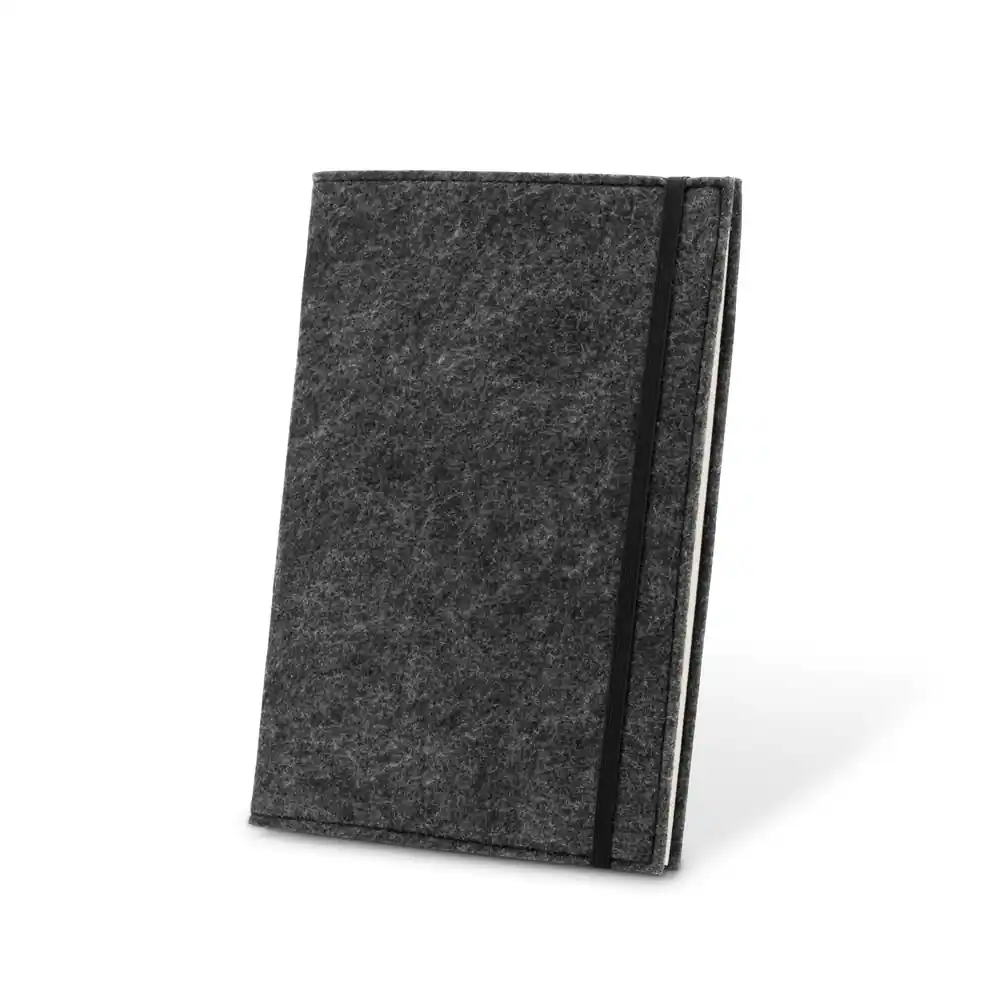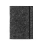 Capa em feltro 100% reciclado, com caderno A5 no interior. O caderno removível contém a capa em papel 100% reciclado, bem como 160 páginas pautadas (70 g/m²) cor de marfim também em papel 100% reciclado. 150 x 210 mm