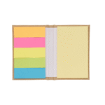 Bloco de anotações com capa dura em papel reciclado, sticky notes e miolo com 22 folhas sem pauta na cor amarela.