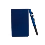 O bloco conta com 100 folhas não pautadas. Caneta esferográfica em ABS azul. Conta com tampa com abertura nas laterais, acabamento fosco, clipe em Metal e ponteira touch em Silicone preto. Carga esferográfica azul.