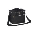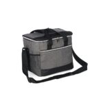 Bolsa térmica de poliéster 18 litros. Contém bolso frontal com zíper, bolsos laterais telados, alça de mão em nylon e alça transversal regulável (não removível) com apoio para ombro.