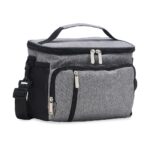 Bolsa térmica de poliéster com três compartimentos, capacidade de 9 litros. A bolsa possui revestimento térmico em PEVA atóxico com costura soldada (não vaza), alça de mão, bolsos laterais telados e acompanha alça transversal.