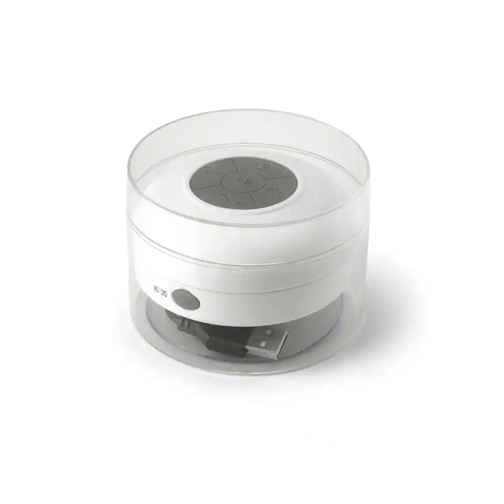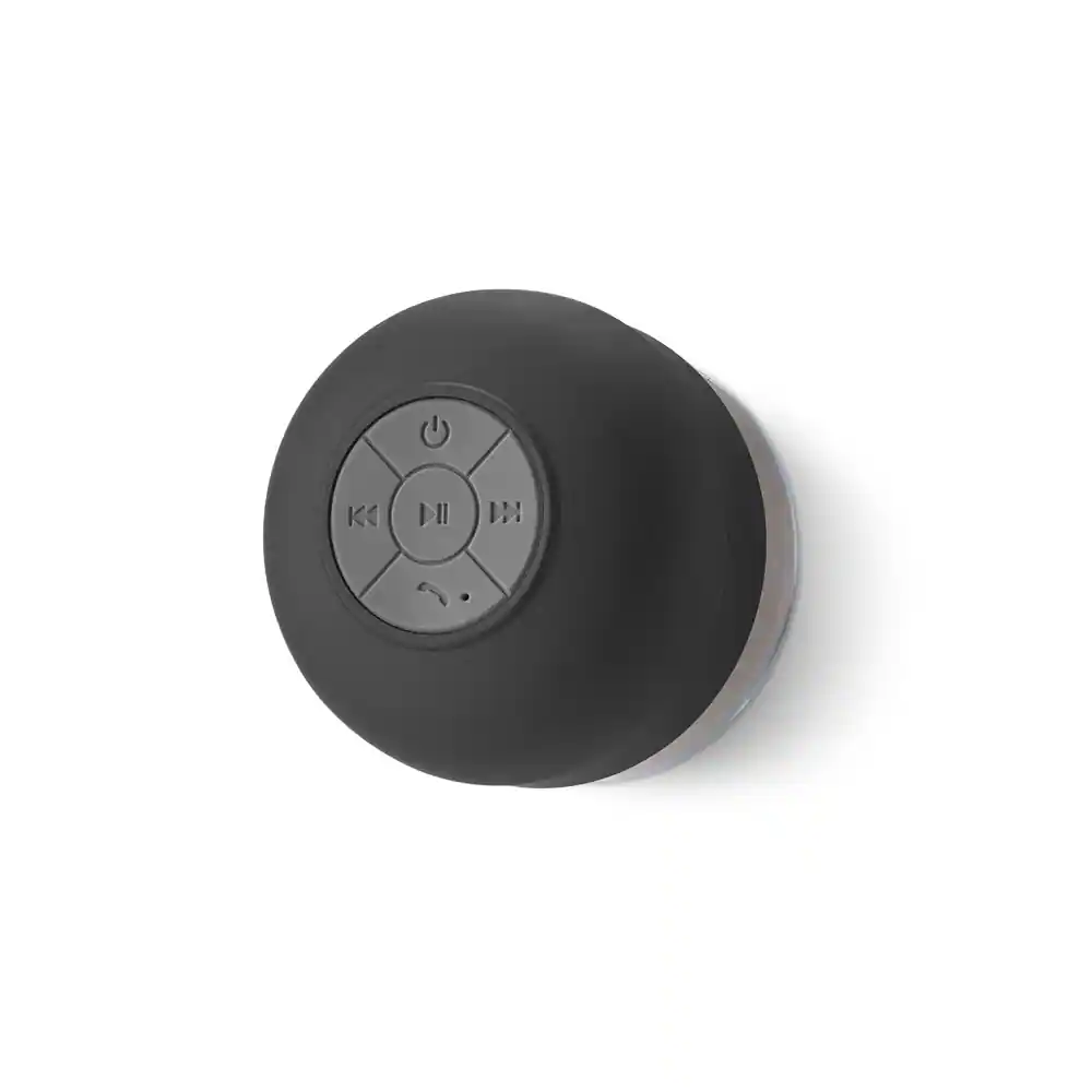 Caixa de som, com microfone, à prova de água em ABS com acabamento emborrachado com ventosa. transmissão sem fios BT v5’0 e potência de 3W/4Ω. Autonomia aproximada de 3 h. Função para atender chamadas, controle de volume e conexão à playlist do dispositivo móvel. Incluso cabo para carregamento. Fornecida em caixa presente. ø85 x 50 mm | Caixa: 88 x 88 x 55 mm