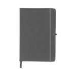 Caderneta emborrachada com porta caneta elástico em nylon, marcador de página em cetim e fita elástica de nylon para fechar. Contém aproximadamente 80 folhas pardas sem pauta.