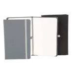Caderno para anotações cinza com capa dura.