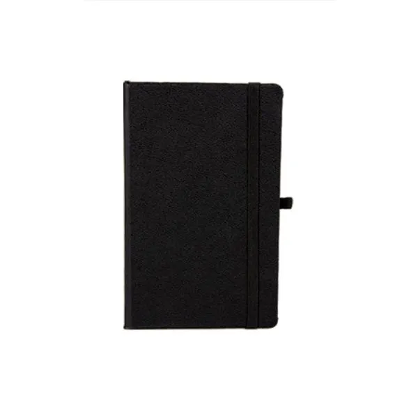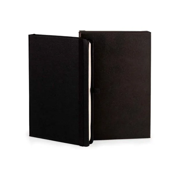 Caderno para anotações preto com capa dura.