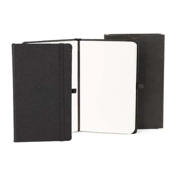 Caderno para anotações preto com capa dura.