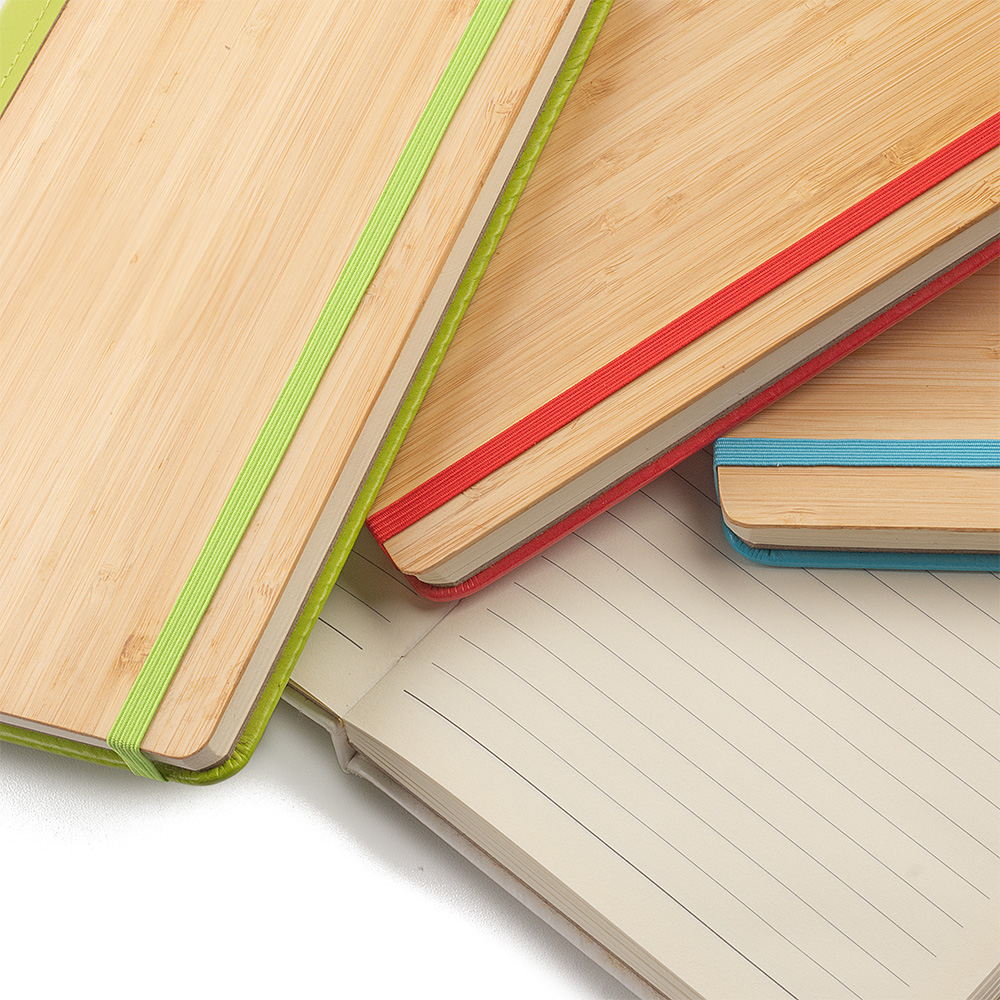 Caderno de anotações, capa de bambu e PU com elástico e miolo com 70 folhas.