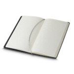 Caderno produzido com capa em tecido RPET e suporte para caneta na capa, capa dobrável para suporte de smartphone, miolo com 80 folhas pautadas.