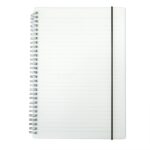 Caderno B5 com capa plástica e elástico para lacre, contém aproximadamente 80 folhas marfim com pauta.