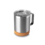 Caneca térmica em aço inox com parede dupla, capacidade de 350ml. Contém tampa com acesso para o bocal e base em cortiça.
