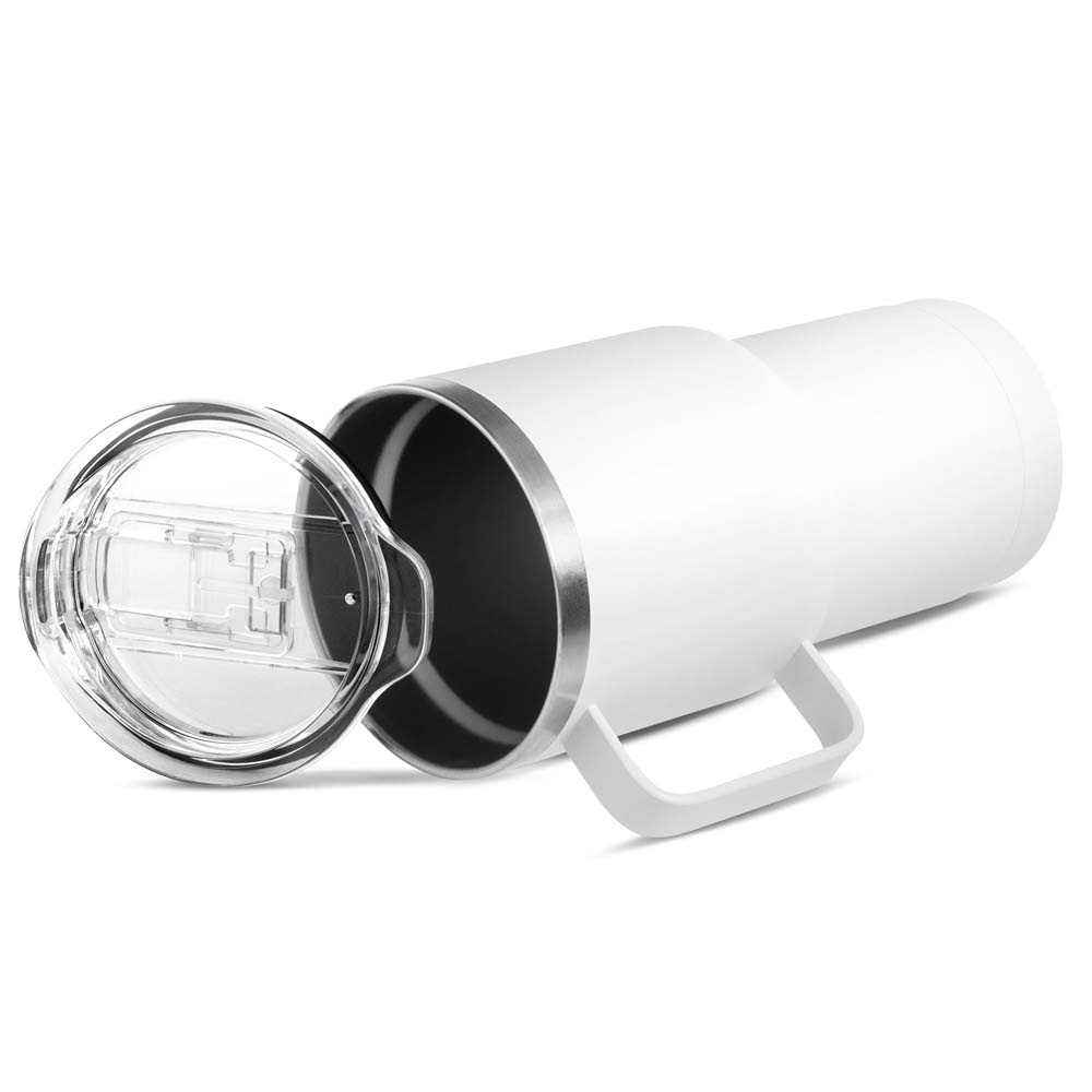 Caneca térmica em aço inox com parede dupla isolada à vácuo, tampa plástica e anel em silicone para vedação, alça lateral. Capacidade 600ml, parede externa com pintura a pó