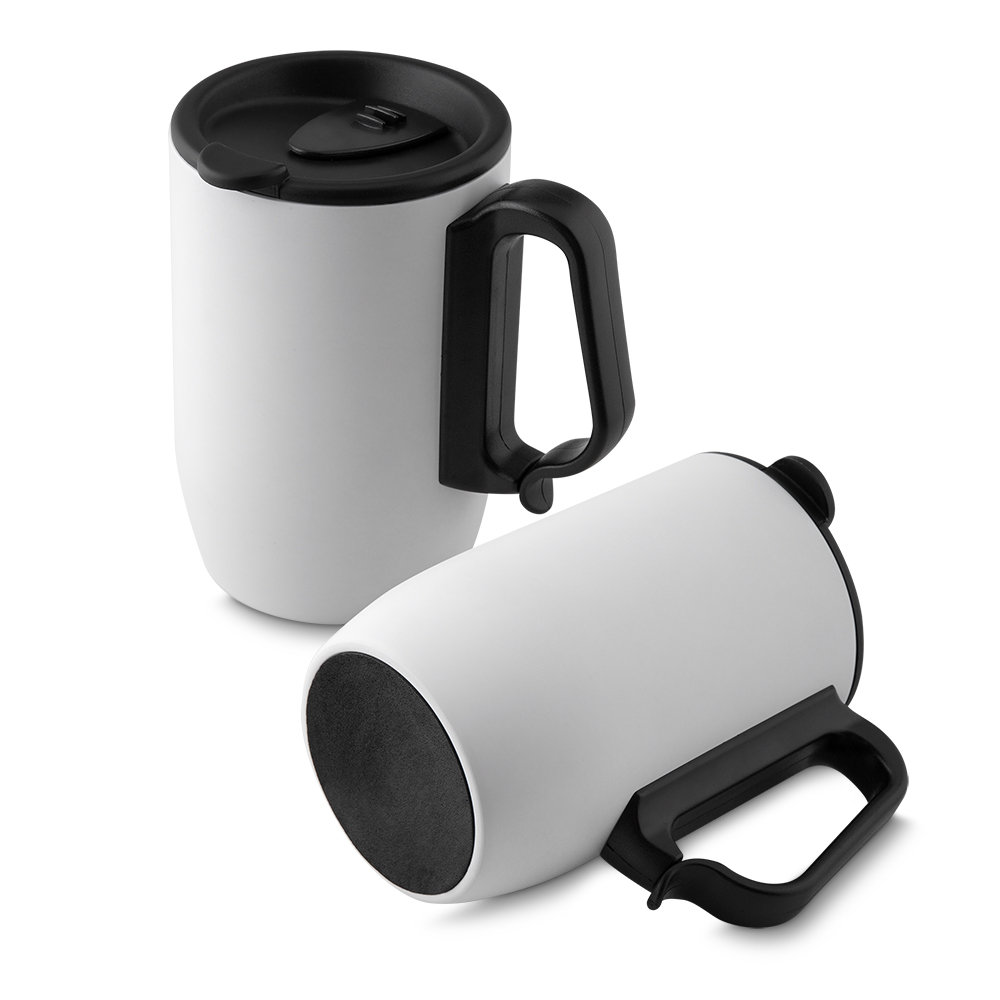 Caneca Térmica em aço inox de 350ml, alça de mão plástica tipo mosquetão, tampa com vedação e base de apoio em EVA.