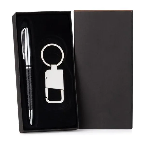 Conta com caneta em metal/material sintético com carga esferográfica azul e chaveiro em metal com mosquetão.
