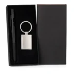 Conjunto caneta e chaveiro. Composto por caneta esferográfica em ABS preta com tampa que contém aberturas nas laterais, acabamento fosco, clipe em metal, ponteira touch em silicone preto e carga esferográfica azul. Conta também com chaveiro em metal injetado em liga de Zamac, acabamento cromado fosco, detalhes e argola em cromado brilhante