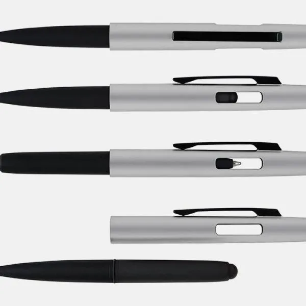 Conta com tampa com abertura nas laterais, acabamento fosco, clipe em metal e ponteira touch em Silicone preto. Carga esferográfica azul.