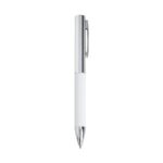 Caneta metálica com carga esferográfica azul e acionamento por rotação.