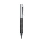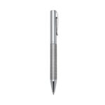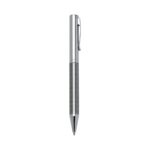 Caneta metálica com carga esferográfica azul e acionamento por rotação.