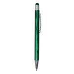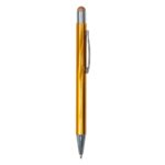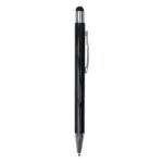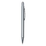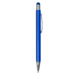 Caneta metálica com touch screen, carga esferográfica azul e acionamento por clique.