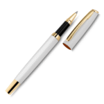 Caneta em metal roller com escrita em azul.