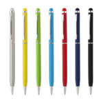 Caneta esferográfica de metal escrita em azul, emborrachada, touch