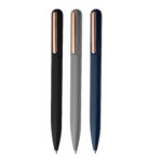 Caneta esferográfica em latão reciclavel com escrita em azul.