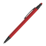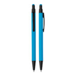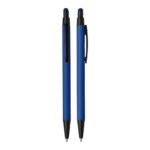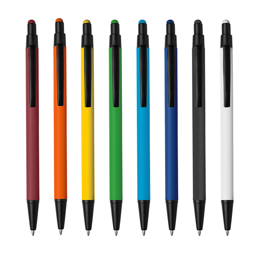 Caneta esferográfica em metal Emborrachada com ponta touch escrita em azul.