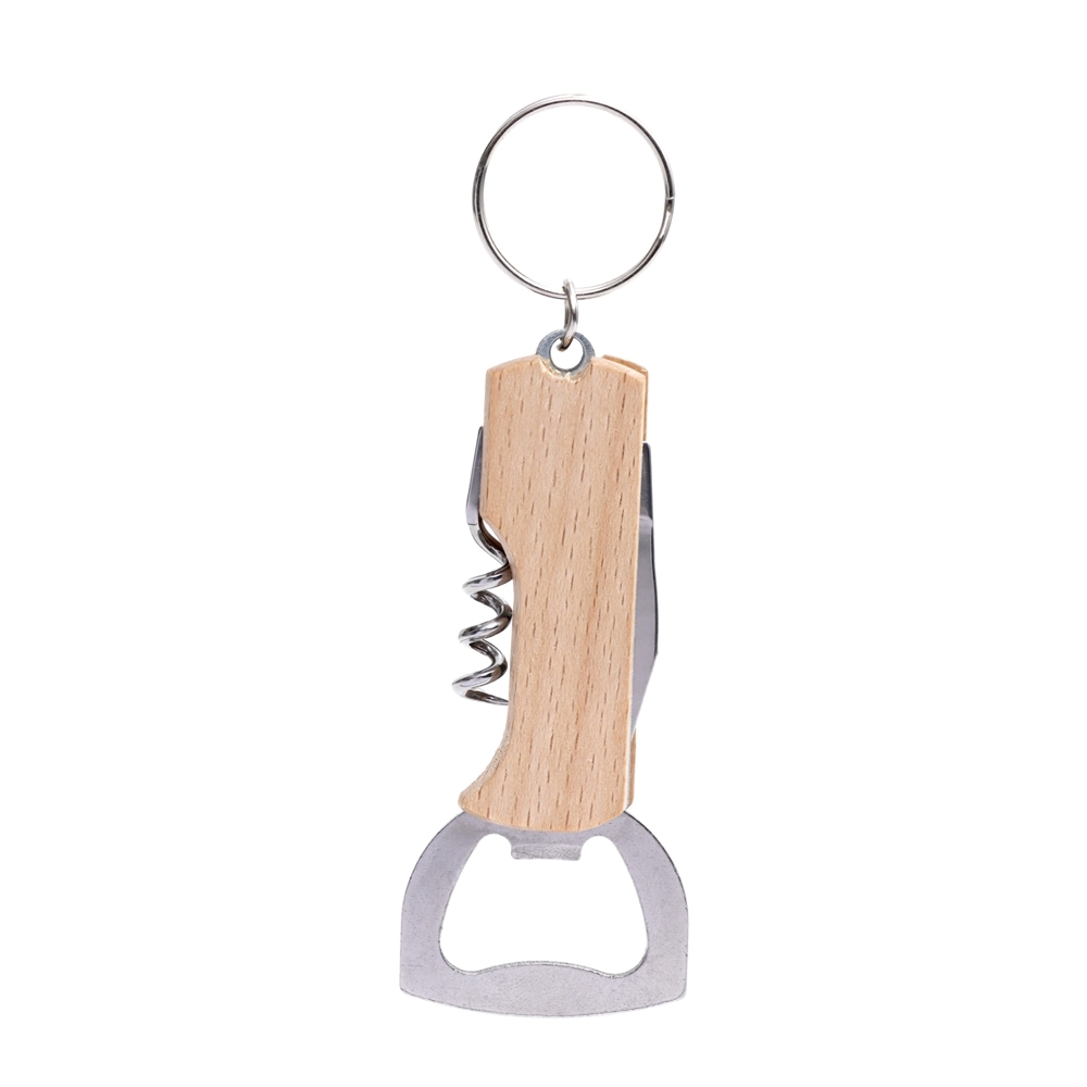 Chaveiro multifunções em madeira com abridor de garrafas, saca-rolhas e lâmina de corte.