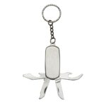 Chaveiro canivete 4 funções de metal liso(ambos lados). Possui: abridor de lata, lixa, lâmina de corte e abridor de garrafa.