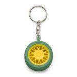 Chaveiro plástico formato pneu, aro detalhado plástico colorido de um lado e lado inverso liso(possível aplicar resina). Pneu emborrachado.