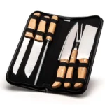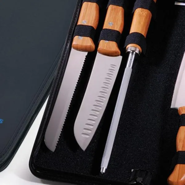 Conjunto composto por faca 8”, cutelo 6” e garfo trinchante em Madeixa/Inox; chaira 8”, faca Santoku 7” e faca 7” para pão em Bambu/Inox. Estão organizados em fita elástica preta no interior de um estojo.