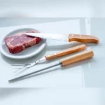 Conjunto de Faca em Madeira/Aço Inox; Acompanha faca 7”, garfo e chaira em Madeira/Inox e caixa para presente. Como cortesia, fazemos uma gravação na lâmina da faca com os cortes do boi.