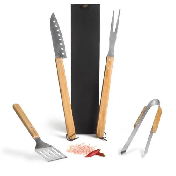 Conjunto em bambu/madeira/aço inox. Acompanha faca e garfo para churrasco, pegador e espátula perfurada em madeira/inox.