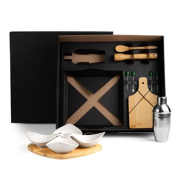 Conjunto para caipirinha com petisqueira, coqueteleira, tábua e utensílios