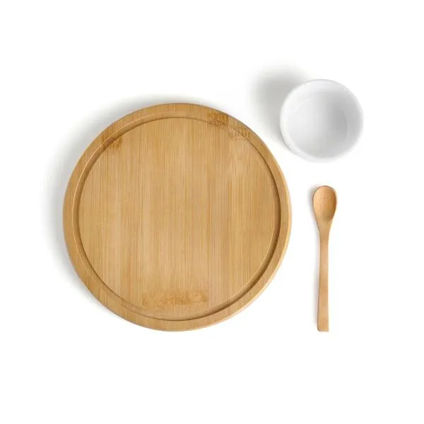 Acompanha tábua e colher em Bambu, conta também com ramekin e porcelana.