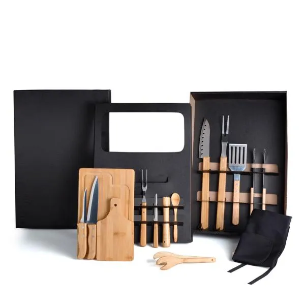 Composto por tábua para Churrasco, tábua para Caipirinha, pegador, socador e colher de 18 cm em Bambu; faca 7”, garfo e faca para Churrasco em Bambu/Inox. Acompanha também espátula, pegador perfurado, faca 4″ e garfo trinchante em Madeira/Inox.