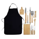 Kit para Churrasco e Caipirinha com estojo e avental. Composto por estojo em tecido preto com alça de mão e avental; tábua para Churrasco, tábua para Caipirinha, pegador e socador em Bambu; faca 7”, faca para Churrasco, pegador para Churrasco, espátula para churrasco e garfo para Churrasco em Bambu/Inox. Acompanha também faca 4″ para frutas, faca 5″ para desossar e garfo trinchante em Madeira/Inox.