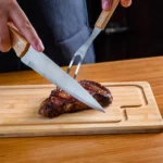 Kit para churrasco; Conta com tábua em Bambu; Faca 7″ e garfo em aço Inox/Madeira.