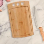 Conjunto para Cozinha. Composto por tábua com três furos em Bambu e faca 8” em Madeira/Inox.
