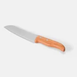 Conjunto para Churrasco. Composto por uma tábua retangular em tripla camada invertida de Bambu com sulco; faca Santoku 7” em Bambu/Inox; garfo trinchante e faca 8″ em Madeira/Inox.