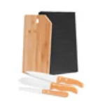 Kit para Cozinha em Bambu/Inox. Composto por tábua em Bambu com furo; faca 7”, faca Santoku em Bambu/Inox. Composto também por faca 4″ para frutas em Madeira/Inox.