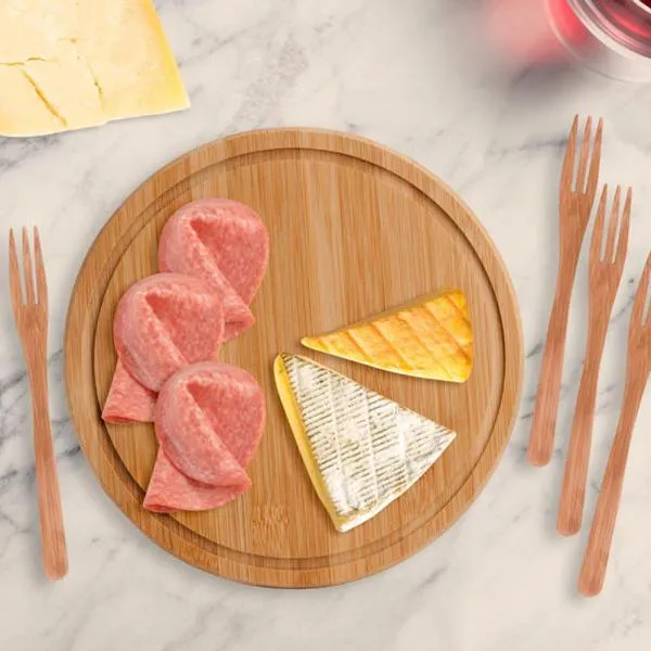 Conjunto composto por uma tábua redonda em tripla camada invertida de bambu, que proporciona maior durabilidade e resistência, com Ø 21cm e seis garfinhos para Petisco/Queijo também confeccionados em bambu.