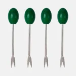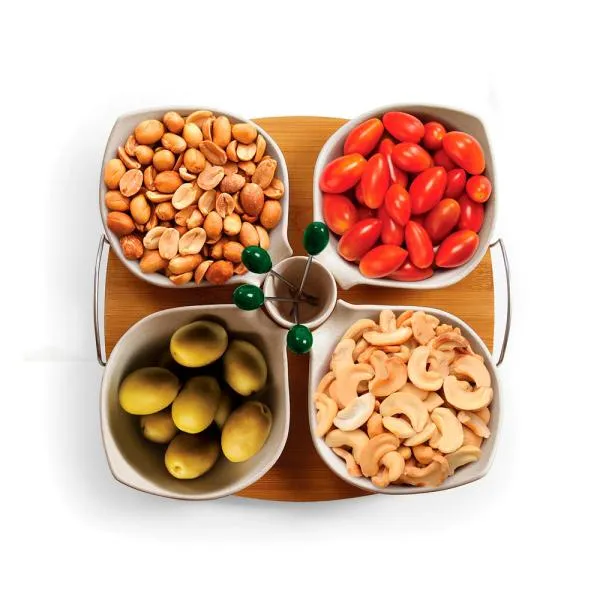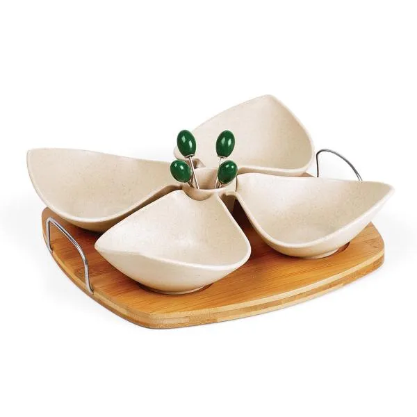 Conjunto para petisco em Bambu/Fibra de bambu. Acompanha cinco potes em fibra de bambu; Quatro garfos em aço Inox com ponta em formato de azeitona e base em bambu com alças em aço Inoxidável.