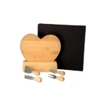 Conta com tábua em formato de coração e base em Bambu; duas facas, sendo, uma com ponta e outra reta, garfo e espátula em Madeira/Inox