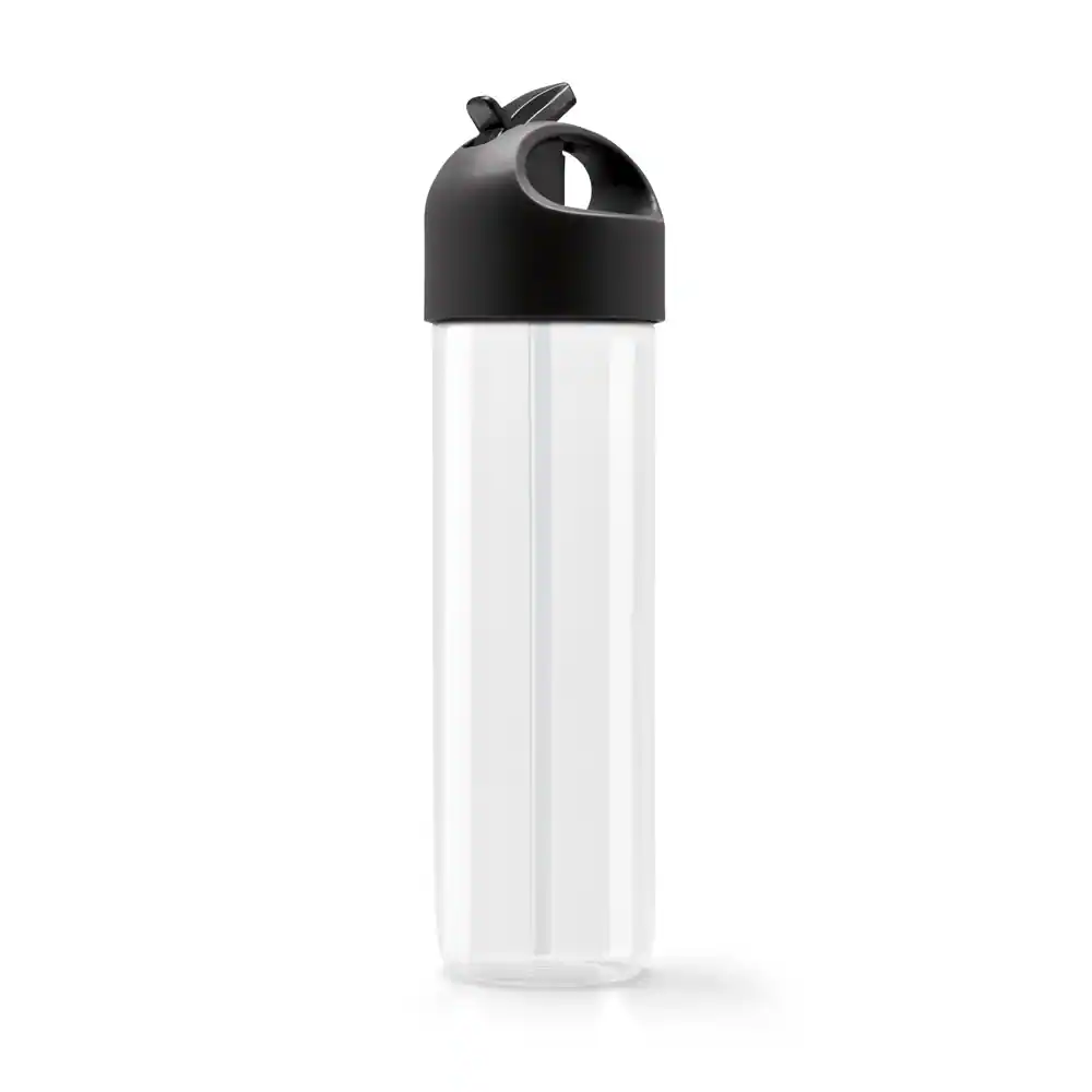 Squeeze em PS com tampa em PE com bico de canudo flexível (no interior) e de abertura fácil. Capacidade até 500 mL. Caixa branca 94651 vendida opcionalmente. Certificação EU Food Grade. ø70 x 230 mm