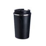 Copo térmico de inox 350ml com parede dupla, parte inferior com borracha antideslizante e tampa rosqueável com abertura de bocal.