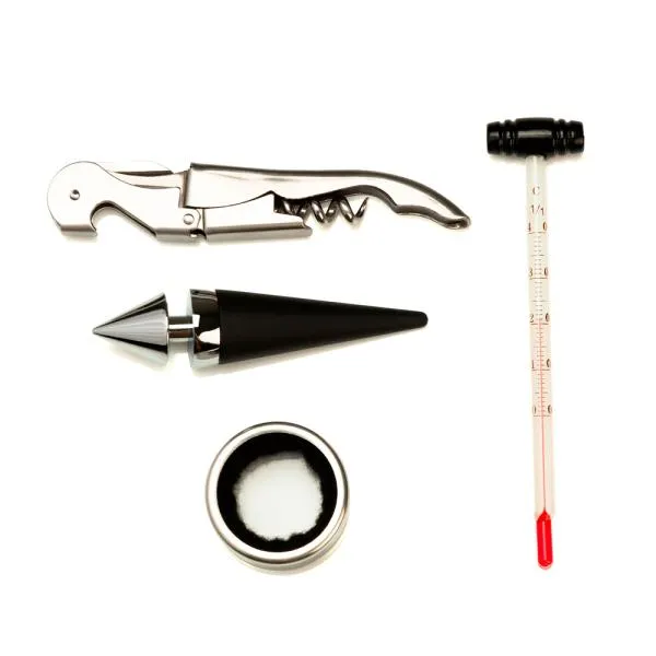 Conta com espaço para a garrafa, tampão, termômetro, anel corta-gotas e abridor saca-rolhas. (NÃO ACOMPANHA GARRAFA)