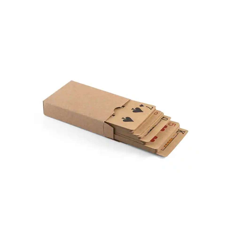 Baralho com 54 cartas clássicas em papel kraft, proveniente de gestão florestal sustentável, ideal para compartilhar bons momentos com amigos e família. Fornecidas em caixa presente de papel kraft reciclado. A cor e o resultado da impressão nos materiais naturais pode variar entre produtos. 60 x 90 x 20 mm