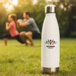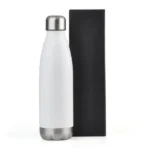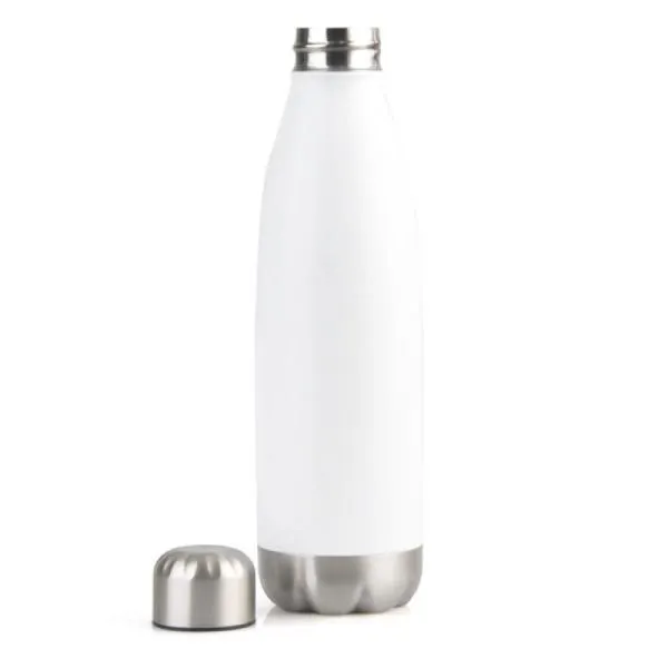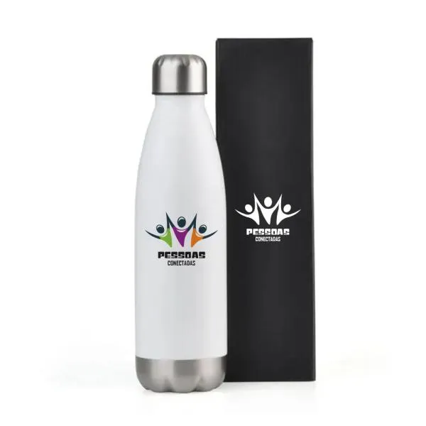 Garrafa em Aço Inox branca com tampa rosqueável e capacidade total de 700ml.