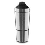 Garrafa coqueteleira em aço inox para proteína com capacidade da garrafa de até 750ml e copo com capacidade de 200ml, acompanha mola para mistura e medidor gavado na parede da garrafa.
